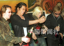 日本紅星反町隆史(圖左二)6日抵港,并立即與香港記者會面。為預祝他個唱演出成功先開香檳,反町隆史將于7日在香港舉行首次個人演唱會。中新社傳真鄧慶樂攝