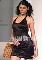 參加“2001亞太區(qū)皮革春季展”的印度模特,27日向客商展示印度生產(chǎn)的女式皮包。中新社傳真 任晨鳴 攝