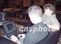 四月三日夜間至四日凌晨,海口文華大酒店中外記者云集,準(zhǔn)備采訪美國駐華使館預(yù)定在這里舉行爾后取消的記者招待會。圖為兩名美聯(lián)社記者在現(xiàn)場用電腦發(fā)稿。中新社記者 莫成雄 攝