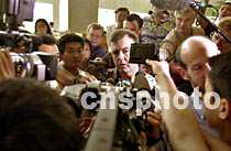 美國使館人員六日清晨在中國海南省海口市文華大酒店向新聞界說,等候北京的安排,才能再次探望美國軍用偵察機(jī)機(jī)組人員。中新社記者 賈國榮 攝