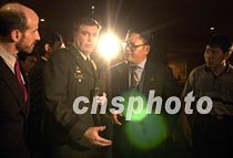 海南省政府外事僑務辦公室主任陳辭與美國駐華使館官員八日凌晨二時返回海口文華酒店,一起出席在此間舉行的新聞發(fā)布會。中新社記者 賈國榮 攝