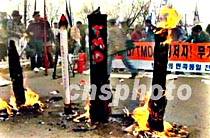 四月七日,韓國市民、學(xué)生在首都漢城集會,抗議美國導(dǎo)彈防御系統(tǒng)和日本通過的美化侵略的歷史教科書。圖為示威群眾當(dāng)眾焚燒了美、日兩國國旗和用紙糊制的導(dǎo)彈模型。中新社圖