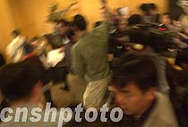 云集?诘囊话俣嗝型庥浾,十一日晚七時許采訪海南省政府外事辦公室在?谖娜A大酒店舉行的新聞發(fā)布會后,立刻爆發(fā)新聞大戰(zhàn),眾記者奮力爭奪中國外長唐家璇接受美國政府致歉信的文稿,然后各自飛奔去發(fā)稿。中新社記者 賈國榮 攝