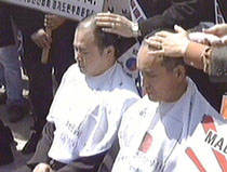 近日,日本文部省通過美化侵略的歷史教科書以來,韓國各界反應強烈。全國各地不斷有游行、焚燒日貨的抗議活動。圖為漢城民眾當眾剃成光頭以示抗議。韓國民眾把頭發(fā)看作先人所賜,只有非常憤怒、失望時才會剃光頭。
