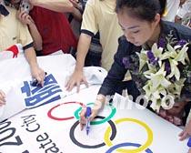 廣州中山大學(xué)、暨南大學(xué)等十所高校十八日在中山大學(xué)聯(lián)合舉行“華南萬名師生支持北京申奧巡回簽名活動(dòng)首簽式,中國奧運(yùn)冠軍劉璇在場簽名。中新社記者 羅仰明 攝
