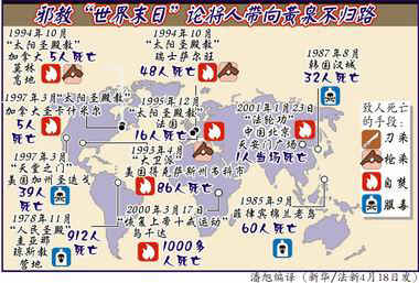 圖表:邪教“世界末日”論帶人走向黃泉不歸路 2001年4月19日 11:15 ![]() 相關(guān)報(bào)道:邪教與“世界末日” 相關(guān)報(bào)道:秘魯一家七口相信世界末日說服毒自殺 相關(guān)報(bào)道:法新社介紹具有破壞性或相信世界末日的幾個(gè)邪教派 |