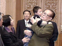 中國國家主席、中央軍委主席江澤民二十日在北京人民大會堂會見被美機撞毀戰(zhàn)機而犧牲的飛行員王偉的家屬時,抱起王偉的兒子相互親吻。