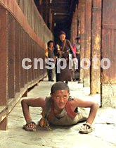 在今夏西藏的大昭寺寺廟里,這些五體投地拜奉佛祖的藏民,要向為其拍照的游客收取二十元的費用。在西藏的一些寺廟里這便成了一種香火生意。中新社記者 宋吉河 攝
