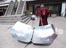 圖:西藏僧人使用太陽灶煮開水 2001年5月9日 19:38 ![]() 西藏拉薩市近郊著名寺廟哲蚌寺僧人在寺院中熟練使用太陽灶煮開水,為保護(hù)青藏高原的生態(tài)環(huán)境,太陽能灶已廣泛在西藏使用。中新社記者 鄒憲 攝 |