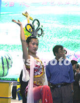 扮演唐朝反彈琵琶的飛天女,十日在中國西部甘肅省的展臺前起舞,為北京國際科技博覽會的綠色工程助興。中新社記者 賈國榮 攝