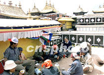 一些修復(fù)布達拉宮墻體的藏族工人在輝煌的金頂旁小憩。西藏拉薩布達拉宮金頂五月開始進行局部整修。中新社記者 滿會喬 攝
