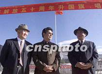 多彩西藏:布達拉宮前看升旗(圖文) 2001年5月24日 06:48 ![]() 中國西藏拉薩布達拉宮廣場二十三日舉行隆重的升旗儀式,慶祝西藏和平解放五十周年。中新社記者 滿會喬 攝 ![]() 全國人大常委會副委員長、西藏自治區(qū)政協(xié)主席帕巴拉·格列朗杰(中),自治區(qū)黨委常務(wù)副書記、自治區(qū)人大主任熱地(右)等出席了在拉薩布達拉宮廣場舉行的“升國旗·唱國歌”儀式。中新社記者 滿會喬 攝