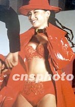 日前,在北京舉辦的內衣品牌“歐迪芬”2001夏季新款展示會上,中國名模張君小姐身穿紅色外套、紅色內衣邊展邊舞。中新社記者 錢興強 攝