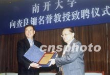 圖文:金庸受聘為南開(kāi)大學(xué)文學(xué)院名譽(yù)教授 2001年5月28日 10:42 ![]() 著名武俠小說(shuō)家金庸先生五月二十八日受聘為南開(kāi)大學(xué)名譽(yù)教授。圖為南開(kāi)大學(xué)校長(zhǎng)侯自新(左)向金庸先生(右)頒發(fā)聘書(shū)。中新社記者 孫志民 攝