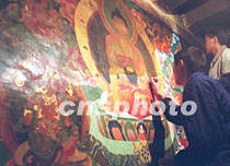 西藏拉薩大昭寺內(nèi)的壁畫正在進(jìn)行整修,工人在不影響游客參觀的情況下加緊施工。中新社記者 滿會(huì)喬 攝