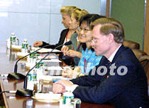 石廣生會見美貿(mào)易代表 雙方還將進(jìn)一步商議 2001年6月5日 15:44 ![]() 石廣生與美國貿(mào)易談判代表羅伯特·佐立克一行會晤。中新社記者 潘索菲 攝 ![]() 二○○一年APEC貿(mào)易部長會議將于六月六日開幕。會議主席、中國外經(jīng)貿(mào)部部長石廣生和中國代表團(tuán)團(tuán)長、外經(jīng)貿(mào)部首席談判代表龍永圖,五日在上海國際會議中心與經(jīng)濟(jì)體代表團(tuán)團(tuán)長舉行雙邊會談。圖為美國貿(mào)易談判代表羅伯特·佐立克。中新社記者 潘索菲 攝