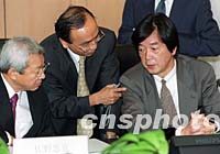 日方代表團(tuán)團(tuán)長(zhǎng)田中均(右)七月三日在北京就中日貿(mào)易磨擦問題與中方進(jìn)行正式磋商。圖為田中均與佐野忠克等人談判前交換意見。中新社記者 鄒憲 攝