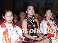 7月13日,國際奧委會112次會議在莫斯科世界貿(mào)易中心舉行會議,表決2008年奧運會舉辦城市。圖為北京申奧代表員成員們劉璇、鞏俐、王楠(左至右)到場聆聽北京代表團陳述報告。中新社記者 王瑤 攝