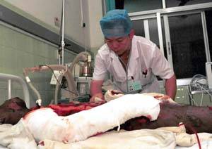 圖:南寧發(fā)生一起“法輪功”癡迷者自焚事件 2001年07月26日 20:38 ![]() 這是南寧市第一人民醫(yī)院燒傷科醫(yī)生在搶救駱貴立。新華社記者 陳天湖 攝