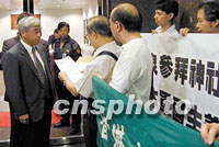 圖:香港團體游行,抗議日本首相參拜靖國神社 2001年08月15日 20:32 ![]() 香港多個團體15日舉行示威游行,抗議日本首相小泉純一郎參拜靖國神社。圖為香港教聯(lián)會向日本駐港總領(lǐng)事館遞交抗議信函。 中新社圖 盧峰 攝