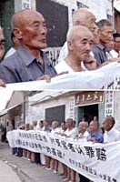 中國(guó)江蘇省崇山村村民,十五日在村委會(huì)前集會(huì),抗議日本首相小泉參拜供奉著二戰(zhàn)甲級(jí)戰(zhàn)犯的靖國(guó)神社。日本侵華期間,有上百名崇山村民,無(wú)辜慘死在日本于此地進(jìn)行的細(xì)菌戰(zhàn)之中。