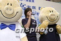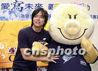 「齊心獻(xiàn)愛寫未來」義賣大行動(dòng)將于18及19日在香港三十多個(gè)大型商場(chǎng)及地鐵站展開義賣行動(dòng),為「中國女童教育項(xiàng)目」籌募經(jīng)費(fèi),圖為陳曉東與義賣精品主角“豬扒家族”成員:豬扒(左)、碧琪(右)。中新社傳真 鄧慶樂 攝