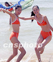 圖:中國模特海邊戲浪 2001年08月20日 15:21 ![]() 在美麗的青島海邊,兩名參加一場模特大賽的靚女身穿泳裝,舞動著絲巾在海浪中盡情起舞。中新社記者 錢興強 攝