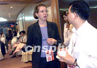 ![]() APEC2001年第三次高官會相關(guān)會議八月二十一日繼續(xù)在遼寧大連舉行,與會代表在會場外交流意見。中新社記者 滿會喬 攝 ![]() APEC2001年第三次高官會相關(guān)會議八月二十一日繼續(xù)在遼寧大連舉行,澳大利亞貿(mào)易官員白儒石接受記者采訪。中新社記者 滿會喬 攝