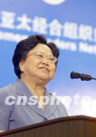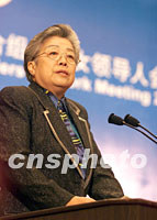 ![]() 2001年亞太經(jīng)合組織女領(lǐng)導(dǎo)人會議二十二日在北京人民大會堂開幕,中國全國人大常委會副委員長、中華全國婦女聯(lián)合會主席彭珮云在會上致詞。中新社記者 毛建軍 攝 |