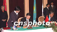 組圖:朱镕基訪問哈薩克斯坦 2001年09月12日 22:34 ![]() 正在哈薩克斯坦訪問的中國總理朱镕基九月十二日在阿斯塔納與哈總理托卡耶夫會見記者時表示,世界各國應(yīng)共同努力反對和制止一切恐怖主義和暴力活動。中新社記者 孟慶雷 攝 ![]() 首次訪問哈薩克斯坦共和國的中國總理朱镕基,九月十二日在哈首都阿斯塔納與哈總理托卡耶夫共同簽署中哈聯(lián)合公報。中新社記者 孟慶雷 攝