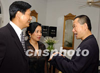 ![]() 澳門政府4日邀請香港巨星周潤發(fā)出席"第十五屆澳門國際音樂節(jié)"中的臥虎藏龍音樂會,澳門文化局局長何麗鉆向發(fā)仔贈送紀念品。中新社圖 任晨鳴 攝 ![]() 專程到澳門出席 "第十五屆澳門國際音樂節(jié)"臥虎藏龍音樂會的香港巨星周潤發(fā)和夫人,4日與奧斯卡金像獎得主、著名指揮家譚盾在澳門喜相逢。中新社圖 任晨鳴 攝