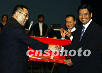 ![]() 澳門政府4日邀請(qǐng)香港巨星周潤發(fā)出席"第十五屆澳門國際音樂節(jié)"中的臥虎藏龍音樂會(huì),澳門文化局局長何麗鉆向發(fā)仔贈(zèng)送紀(jì)念品。中新社圖 任晨鳴 攝 ![]() 專程到澳門出席 "第十五屆澳門國際音樂節(jié)"臥虎藏龍音樂會(huì)的香港巨星周潤發(fā)和夫人,4日與奧斯卡金像獎(jiǎng)得主、著名指揮家譚盾在澳門喜相逢。中新社圖 任晨鳴 攝