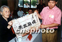 圖:辛亥革命后人給長樂市村民送當年實物 2001年10月12日 18:15 ![]() 辛亥革命老人、孫中山先生秘書黃展云的女兒黃以雍,十一日以九十三歲的高齡專程赴長樂市,為其父于一九二七年創(chuàng)辦的“營前模范村”后人林泉送上父親當年親筆提寫的匾額。中新社圖 陳勇 攝 |