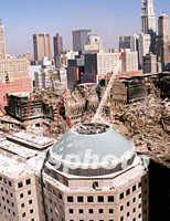 圖:紐約世貿(mào)中心斷垣殘壁 2001年10月13日 11:35 ![]() 采訪者近日從曼哈頓高處鳥瞰紐約世貿(mào)中心一號(hào)樓和周邊建筑廢墟,前面圓頂樓為世界金融中心,美林、運(yùn)通、李門兄弟等著名金融公司就設(shè)在這里。“九一一”恐怖襲擊前,金融中心有天橋與世貿(mào)中心相連,“九一一”時(shí)天橋坍塌,樓頂現(xiàn)布滿建筑破損物。中新社圖 龔文謨 攝 |
