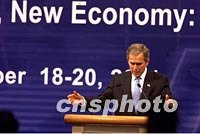 圖:美國(guó)總統(tǒng)布什在APEC的CEO峰會(huì)演講 2001年10月20日 16:09 ![]() 美國(guó)總統(tǒng)布什二十日在上海香格里拉飯店舉行的亞太經(jīng)合組織工商領(lǐng)導(dǎo)人峰會(huì)上發(fā)表演講。中新社記者 毛建軍 攝 |