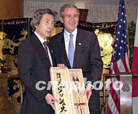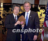 組圖:布什會見小泉純一郎 2001年10月20日 16:10 ![]() 10月20日,美國總統(tǒng)布什(右)在上海下榻的酒店會見日本首相小泉純一郎。圖為布什向小泉贈送棒球手套。中新社圖 ![]() 10月20日,美國總統(tǒng)布什在下榻的酒店會見日本首相小泉純一郎。圖為小泉純一郎(左)向布什贈送禮品。中新社圖