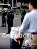 ![]() 一位女警察在東方明珠廣場前值勤。為保障亞太領(lǐng)導人非正式會議順利進行,上海東方明珠國際新聞中心和國際會議中心前的路段二十日實行戒嚴。中新社記者 劉殊瑾 攝