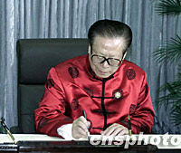 圖:江澤民簽名留念 2001年10月21日 17:29 ![]() 10月21日,出席2001年亞太經(jīng)合組織領(lǐng)導(dǎo)人非正式會(huì)議的中國(guó)國(guó)家主席江澤民在上?萍拣^簽名留念。中新社圖 |