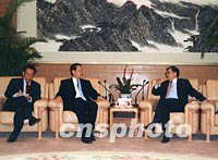 圖:龍永圖會(huì)見香港新聞界高層人士訪問團(tuán) 2001年10月30日 16:37 ![]() 外經(jīng)貿(mào)部副部長(zhǎng)、中國(guó)“入世”首席談判代表龍永圖(中),二十九日會(huì)見來(lái)訪的香港新聞界高層人士訪問團(tuán)時(shí)說(shuō),中國(guó)“入世”有助香港經(jīng)濟(jì)。中新社記者 張明新 攝 |