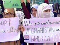 組圖:美、英對阿富汗軍事打擊進入第四周 2001年11月01日 09:44 ![]() 阿富汗坎大哈民眾在美軍空襲之際整理破損的家園。美軍三十一日首次出動B-52轟炸機,使四周來遭轟炸的坎大哈滿目瘡痍,幾乎沒有一座完整的房屋。 ![]() 二百多名巴基斯坦婦女兒童三十一日走上街頭,反對美國對阿富汗進行軍事打擊。美國對阿富汗的軍事打擊日前進入第四周。