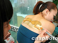 圖:北京女孩喜愛彩色體繪 2001年11月04日 18:08 ![]() 一個時尚女孩周末在北京體繪店內(nèi)請工作人員在她的后背繪上彩豹圖案。體繪出現(xiàn)在五千年前的古印度,在京城里,是專為酷哥靚妹們拍照,聚會時展示個性服務(wù)的。中新社記者 陳鋒 攝 |