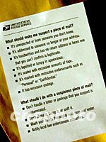 本網(wǎng)特稿:奪命孢子牽動(dòng)美國(guó)“神經(jīng)”(附圖) 2001年11月05日 15:02 ![]() 十余例由信件引起的炭疽病菌感染已造成美國(guó)民眾的恐慌心理,美國(guó)郵政總局局長(zhǎng)波特向全美一億四千七百多個(gè)郵件地址發(fā)出明信片,它提醒民眾小心處理郵件。該圖是明信片的背面,它告誡人們哪些郵件值得懷疑;如何處理有懷疑的郵件。中新社 徐德金 攝 ![]() 1998年挪威的特隆郝姆警察博物館館長(zhǎng)發(fā)現(xiàn)了一塵封已久的玻璃瓶,標(biāo)簽上寫著“一塊糖中藏有炭疽菌--1917年Otto Karl von Rosen男爵作為間諜嫌疑時(shí)從他的行李中發(fā)現(xiàn)的”。英國(guó)科學(xué)家與挪威微生物科學(xué)家檢測(cè)證實(shí),它是恐怖的B型炭疽。顧建文攝