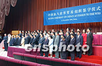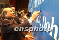 中新社記者卡塔爾特寫(xiě):今宵多歡樂(lè)(附圖) 2001年11月12日 02:42 ![]() 中國(guó)加入WTO簽字儀式于北京時(shí)間12日凌晨在多哈舉行,圖為簽字現(xiàn)場(chǎng)。中新社記者 錢興強(qiáng) 攝 ![]() 石廣生部長(zhǎng)于北京時(shí)間12日在多哈簽署中國(guó)入世議定書(shū)后,在會(huì)場(chǎng)橫幅上簽名留念,記錄下這一歷史時(shí)刻。中新社記者 錢興強(qiáng) 攝