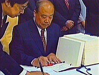 中國(guó)入世議定書簽字花絮:英雄用“英雄” 2001年11月12日 18:53 ![]() 中國(guó)代表團(tuán)團(tuán)長(zhǎng)石廣生于當(dāng)?shù)貢r(shí)間11日晚在多哈簽署中國(guó)入世議定書。中新社記者 錢興強(qiáng) 攝 ![]() 中國(guó)代表團(tuán)團(tuán)長(zhǎng)石廣生于北京時(shí)間十二日零點(diǎn)許在卡塔爾首都多哈喜來(lái)登飯店簽署中國(guó)加入世貿(mào)組織議定書。中新社圖