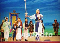 圖:金庸小說(shuō)《射雕英雄傳》搬上京劇舞臺(tái) 2001年12月11日 17:27 ![]() 武漢市京劇團(tuán)根據(jù)金庸的武俠小說(shuō)《射雕英雄傳》改編而成的同名京劇,十二月十日晚在南京大行宮會(huì)堂成功上演,成為第三屆中國(guó)京劇節(jié)唯一的一臺(tái)武俠劇。原著中描寫高深莫測(cè)的武功借助京劇中的“出手”及現(xiàn)代特技,得到了較好表現(xiàn)。中新社圖 劉小楚 攝 |