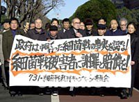 圖:侵華日軍細(xì)菌戰(zhàn)案結(jié)束法庭調(diào)查舉證 2001年12月26日 18:38 ![]() 一百八十名中國(guó)受害者起訴侵華日軍七三一部隊(duì)實(shí)施細(xì)菌戰(zhàn)罪行的訴訟歷時(shí)四年之久,26日結(jié)束了法庭調(diào)查舉證階段,明年春將予判決。圖為中國(guó)原告代表與日本代理律師在26日開(kāi)庭前,在東京地方法院前宣示決心。中新社記者 陶光雄 攝 |