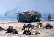 假想解放軍登陸 臺(tái)軍今早在澎湖實(shí)彈演習(xí)(圖) 2001年12月27日 15:58 臺(tái)軍進(jìn)行沙灘演習(xí)(資料圖片) 中新網(wǎng)香港12月27日消息:臺(tái)北訊,臺(tái)灣軍方的澎湖“國(guó)防司令部”,今天清晨實(shí)施反登陸實(shí)彈演習(xí),操演過程中試射各種火炮。 澎湖“國(guó)防司令部”今早集結(jié)部隊(duì),在西嶼外海展開“聯(lián)信240號(hào)”演習(xí)。其間進(jìn)行沙盤推演,圖上作業(yè)標(biāo)定目標(biāo),隨即用軍方的105、155榴彈炮進(jìn)行對(duì)海射擊。 之后,臺(tái)軍使用40防空炮對(duì)空射擊,進(jìn)行擊機(jī)的操演。 臺(tái)灣軍方表示,操演是以實(shí)兵實(shí)彈射擊,已驗(yàn)證臺(tái)軍的陸?杖娐(lián)合作戰(zhàn)能力。 有參加演習(xí)的軍官聲稱,此次軍事操演的目的是假想解放軍在臺(tái)登陸,臺(tái)軍則以榴炮和機(jī)槍炮“綿密的射擊”,“阻止”解放軍登陸。 臺(tái)軍方聲稱,演習(xí)中,整個(gè)反舟波火炮射擊都命中目標(biāo)。 |