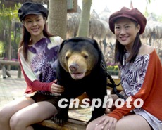 來自曼谷的王麗君(右)和溫哥華的周雪一起親近馬來熊,十二日她們與眾佳麗在香江野生動物世界展開一系列的外景拍攝活動。中新社記者 梁永強 攝