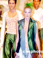 ![]() 香港時裝節(jié)展示前衛(wèi)男女冬裝!跋愀蹠r裝節(jié)2002秋冬系列”的“冬日傳奇”時裝展示1月15日在香港會展中心舉行,模特在“冰天雪地”中展示香港設計師最新設計的男女前衛(wèi)冬裝。中新社傳真 任晨鳴 攝 ![]() 香港時裝節(jié)展示黑紅相佩女冬裝。“香港時裝節(jié)2002秋冬系列”的“冬日傳奇”時裝展示1月15日在香港會展中心舉行,模特在“冰天雪地”中展示香港設計師最新設計的黑紅相佩的女冬裝。中新社傳真 任晨鳴 攝
