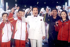 圖:歌星、體育明星春節(jié)晚會(huì)舉杯同慶 2002年02月07日 20:32 ![]() 歌星、體育明星在央視春節(jié)晚會(huì)節(jié)目中演唱《舉杯吧、朋友》,以此慶賀中國申奧成功、足球沖入世界杯連連喜事。中新社圖